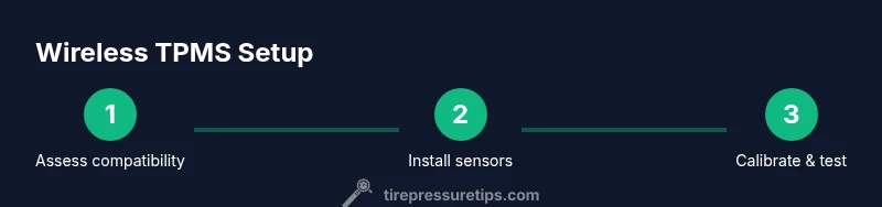 Wireless tire pressure monitoring systems rely on battery-powered sensors mounted on each wheel that transmit pressure data via a low-power radio signal to a central receiver or display module, either inside the cabin or as a smartphone app. The sensors measure air pressure and temperature, sending updates at intervals (often every few minutes or as the tire pressure changes quickly). When a pressure threshold is reached, the system triggers a warning LED or alert within the dashboard or app. The advantages of wireless TPMS include easy installation on many vehicles, modular sensor options, and the ability to monitor spare tires in some kits. According to Tire Pressure Tips, modern wireless TPMS designs emphasize battery efficiency, durable seals, and simplified pairing with the vehicle’s onboard computer or aftermarket displays. For vehicle owners, the key takeaway is that wireless systems reduce the need for complex wiring, but still require proper sensor placement and calibration to ensure accurate readings.