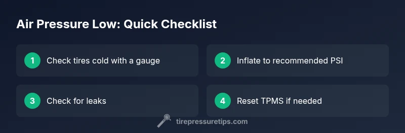 When you see air pressure low in your tires, you’re looking at underinflation that compromises safety, handling, and efficiency. For most passenger vehicles, the recommended PSI is published on the driver’s door jamb sticker or in the owner’s manual, and you should read it when tires are cold. The Tire Pressure Tips team emphasizes that maintaining proper air pressure helps reduce tire wear, improves fuel economy, and preserves tire sidewall integrity. Remember that cold tires reflect true pressure; hot tires will read higher due to heat expansion, so measure before driving when possible. Regular checks are the best defense against a slow leak turning into a roadside emergency.