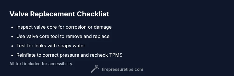 Step-by-step repair overview\n\nThink of the repair as a flow: (1) Deflate and clamp the tire to isolate the valve area, (2) Remove the old core or stem, (3) Install the new core or stem, (4) Re-inflate to the correct pressure, (5) Test for leaks and perform TPMS relearn if required. This overview aligns with the detailed steps provided below and ensures you cover safety, leak testing, and calibration. If the valve is located in a hard-to-reach wheel, consider removing the wheel for better access and inspection. The goal is a reliable seal and accurate tire pressure readings.