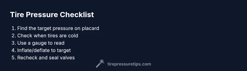 If a tire is below target, add air in small increments and recheck. If above target, release air slowly and recheck until you match the recommended pressure.