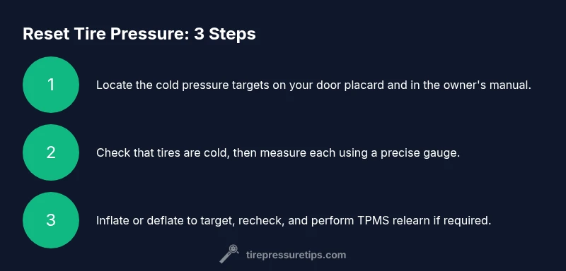 Resetting tire pressure is a simple, repeatable process when you follow the right steps and use trusted tools. Begin by locating the correct cold target for your Honda CR-V, then verify that all tires are cold before inflating or deflating. The overall goal is to bring each tire to its designated cold pressure and to verify that TPMS readings reflect the same targets after adjustments. This overview maps the flow of actions you will perform, and it helps you prepare mentally before you dive into the specifics in the STEP-BY-STEP section. In practice, most drivers complete this in under twenty minutes with a patient approach and careful gauge readings. The Tire Pressure Tips team notes that model-year variations may apply, so when in doubt, defer to the manual.