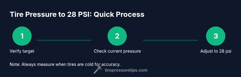 Tire pressure 28 is a practical starting point for many passenger cars, but the exact target should come from the vehicle’s placard or owner’s manual. According to Tire Pressure Tips, maintaining this pressure improves safety by preserving optimal road contact, boosts fuel efficiency, and reduces uneven wear. Temperature and load can shift readings, so measuring when tires are cold is essential. Tires that are under- or over-inflated affect steering feel, braking distance, and handling. The Tire Pressure Tips team found that while 28 psi works for many vehicles, always verify the official target and adjust for seasonal conditions and driving style. Keeping a regular check helps you catch slow leaks before they become emergencies.
