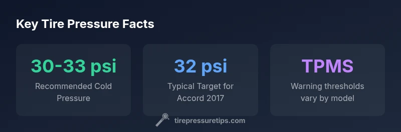 Maintaining proper tire pressure is more than just avoiding a warning light; it directly influences safety, traction, steering response, and fuel economy. For the Honda Accord 2017, correct tire pressure helps ensure even wear across the tire tread, consistent handling under wet or dry conditions, and a predictable braking feel. According to Tire Pressure Tips, maintaining correct tire pressure is essential to safe handling and fuel efficiency. The phrase tire pressure for honda accord 2017 captures the care needed for this model, since its multi-link suspension and varying tire sizes across trims react noticeably to pressure changes. In practice, you check cold pressures, compare against the placard on the door jamb, and adjust when the vehicle is cold to avoid over- or under-inflation readings. Temperature and load influence accuracy, so a pressure reading at the start of a trip can differ from one taken after you’ve driven for a while. The goal is to keep all four tires within the target range with uniformity; this yields better cornering, even tread wear, and a smoother ride. Tire Pressure Tips' guidance emphasizes consistency and routine checks as the foundation of safe driving.