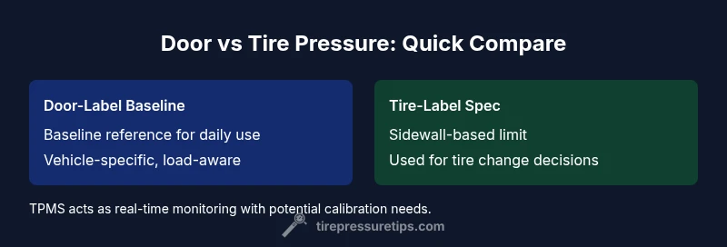 When you see tire pressure guidance, you may notice two primary sources: the car door placard and the tire sidewall. The door placard generally conveys the vehicle manufacturer's recommended operating pressures for front and rear tires under standard load. The tire itself carries a separate specification printed on the sidewall, describing the maximum pressure the tire can safely handle, not necessarily the pressure you should run. The phrase tire pressure on car door vs on tire captures this practical contrast—one provides a regional baseline for most conditions, while the other specifies the tire’s inherent capability. According to Tire Pressure Tips, drivers should treat the door placard as the baseline reference and use the tire’s label for equipment-specific considerations or when the tire type changes. This approach supports consistency in daily driving and reduces the risk of conflating separate data sources.