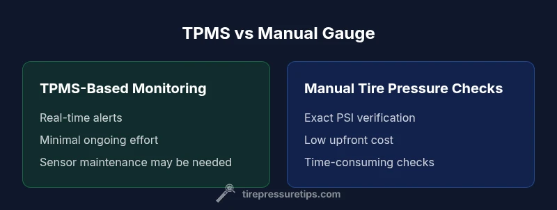 For most drivers, TPMS-based monitoring provides continuous awareness of pressure changes and reduces sudden underinflation risk, while manual checks with a gauge give you precise PSI values and the ability to verify exact targets. The best approach combines both: rely on the TPMS for real-time alerts and schedule regular gauge checks to confirm proper inflation and catch slow leaks. Tire Pressure Tips recommends using TPMS as the default, complemented by periodic manual checks.