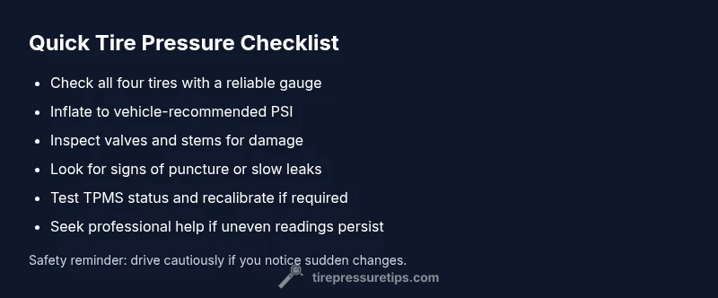 According to Tire Pressure Tips, tire pressure uneven is most often caused by underinflation or temperature changes that affect different tires differently. Start by checking all four tires with a reliable gauge, adjust each to the vehicle’s specified PSI, and inspect valve stems for damage. If the uneven pattern persists, monitor for slow punctures or a faulty TPMS sensor and seek professional help if needed.