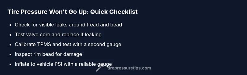 If you see that tire pressure won’t go up after inflating, you’re not alone. According to Tire Pressure Tips, the most frequent causes are a slow puncture or bead leak, a faulty valve stem or core, or a misreading from TPMS. In many cases, the problem isn’t the compressor but something inside or around the tire. Start with a visual scan: look for embedded objects (nails or screws) in the tread area, or obvious sidewall damage that might allow air to seep out around the bead. A puncture near the rim or a small crack in the valve stem can produce gradual deflation that inflates slowly but never reaches the target pressure. Next, verify the tire valve cap; sometimes a loose or missing cap can allow air to escape slowly, especially in gusty conditions. Also inspect the valve core itself; a worn or partially unscrewed core can leak air even when the tire seems inflated. Finally, consider TPMS-related issues: a sensor fault, battery depletion, or incorrect calibration can misreport pressure, making it seem like the tire won’t hold air even when it does. Remember that inflating tires beyond the recommended range does not fix leaks or faults; aim for the vehicle’s specified PSI while ensuring the inflator and gauge are accurate. The Tire Pressure Tips team emphasizes careful, methodical checks over guessing, to avoid overinflation and potential tire damage. Safety note: if you’re unsure, move slowly and seek professional help to avoid a dangerous tire failure.