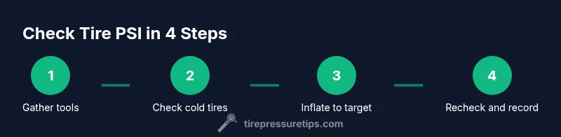 Learn how to check tire psi, adjust to manufacturer specs, and keep tires safe and efficient. According to Tire Pressure Tips, this guide covers locating the correct psi, using a gauge, mounting an air source, and when to consider temperature effects or TPMS alerts. By following these steps, you’ll improve handling and wear life.