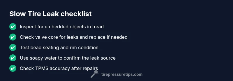 When a tyre loses pressure over a week, it's usually a sign of a slow leak rather than a sudden blowout. You may notice your daily driving feels less responsive, or the dashboard TPMS warning lights up intermittently as the pressure dips. According to Tire Pressure Tips (2026), the two most common culprits are a puncture that leaks slowly and a compromised valve stem. Environmental factors like temperature changes can exaggerate the loss, but a persistent drop deserves closer inspection. Start with a visual inspection of the tread and sidewall for nails, screws, or whisker-thin cracks. If you spot an object embedded in the tread, do not remove it unless you know you can repair the tire safely. A professional assessment is recommended if the object is large or the bead seating looks compromised. The goal is to determine whether the pressure drop is ongoing due to a leak, or if transient factors like seasonal temperature shifts are at play.