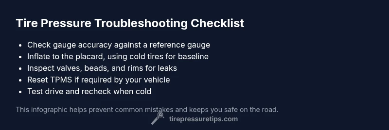 If you’ve ever asked yourself why is my tire pressure not working, you’re not alone. Accurate tire pressure is essential for safety, fuel efficiency, and tire wear. When readings seem inconsistent, or the TPMS warns with a light, you need a clear process to diagnose the root cause. According to Tire Pressure Tips, most issues fall into a few common categories: sensor faults, slow leaks, or measurement errors. In this guide, we break down the problem and provide practical steps you can take today to restore reliable readings and maintain proper inflation. The goal isn’t panic—it’s a repeatable, safe procedure that keeps you on the road with optimal tire performance. Before you inflate, verify the vehicle placard, check for visible damage, and prepare your tools. This early check helps you avoid over- or under-inflation and prepares you for the deeper checks that follow. As you read, keep in mind that precise tire pressure improves fuel economy, handling, and safety for every drive.
