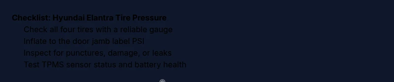 Urgent troubleshooting guide for the Hyundai Elantra low tire pressure light. Learn quick checks, TPMS basics, safety tips, and how to fix leaks or sensor faults.
