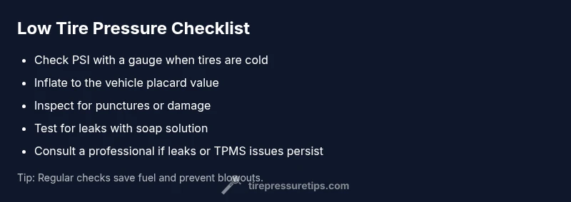 A tire underinflated is not just a soft ride—it's a safety concern and a potential fuel-waster. According to Tire Pressure Tips, the moment you notice a low tire pressure sign, such as a dashboard light, a change in steering feel, or a visibly soft tire, you should investigate promptly. Tire Pressure Tips analysis shows that even a small PSI drop across one tire can alter handling, braking performance, and wear patterns. Before you drive off, verify each tire’s pressure when cold, compare to the vehicle placard, and inspect for obvious defects like nails or cuts. The sooner you confirm a real pressure drop and take corrective action, the sooner you can reduce risk of a puncture, blowout, or excessive tire wear. This block helps you distinguish real underinflation from sensor glitches and outlines practical steps you can take today.