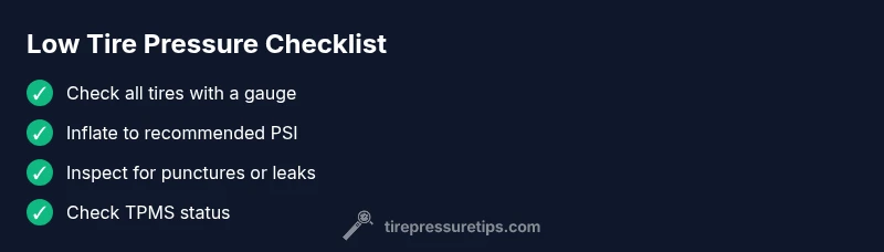 A practical, step-by-step troubleshooting guide to diagnose, inflate, and fix low tire pressure safely, with TPMS insights and prevention tips.