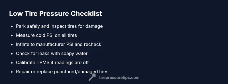 Parking on a flat surface, hazard lights on, and a calm, deliberate approach are the first steps when tire pressure keeps going down. According to Tire Pressure Tips, what to do when your tire pressure keeps going down begins with safety checks before you touch the air. Start by pulling over on level ground, engage the parking brake, and place wheel chocks behind the tires you are not inspecting. Visually inspect all four tires for nails, cuts, bulges, or glass, and listen for a hiss at the valve stems. If you spot a nail or screw, avoid aggressive driving until the tire can be repaired or replaced. Ensure you have a working air pump or access to a service station, and check pressures when the tires are cold. Don’t forget the spare—confirm it’s inflated and ready in case you need it. If you notice damage to the rim or bead area, call roadside assistance rather than attempting a risky repair. Finally, record the tire pressures for each wheel to establish a baseline for future checks.