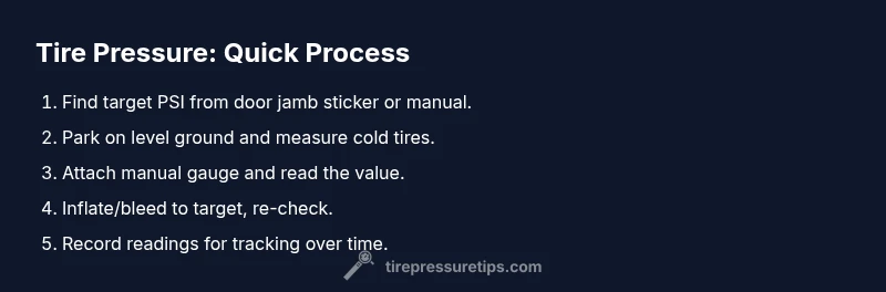 Tire pressure is commonly measured in PSI (pounds per square inch) or kPa (kilopascals). A reliable air pressure manual gauge displays a reading as soon as you press the valve stem, and many gauges offer a dial or a digital readout. Key terms to know include the target PSI value for your vehicle, the minimum and maximum range of your gauge, and the difference between cold and hot readings. The manual gauge relies on a mechanical or spring-loaded system to translate the air pressure into a readable scale. When selecting a gauge, ensure readability, durability, and a clear scale. In general, the air pressure manual method provides a tangible, no-battery-required way to verify factory-recommended pressures.