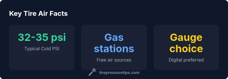 Looking for car tire air near me? The quickest path is to locate a nearby gas station or auto shop that offers free air, then verify your current PSI with a tire gauge. Most passenger tires run best around 32-35 psi when cold, but always follow the vehicle manufacturer's recommendation found on the door jamb or owner's manual. Use a digital gauge for accuracy.