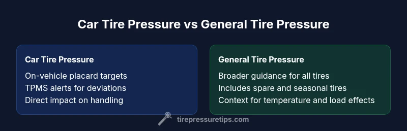 Car tire pressure vs tire pressure: understanding the distinction helps you stay safe and efficient. According to Tire Pressure Tips, car tire pressure refers to the pressures specified for tires mounted on your vehicle, while tire pressure covers broader concepts including spare tires, loading scenarios, and general guidance. The practical takeaway is to follow the vehicle placard for on-car tires, check cold, and account for temperature and driving conditions.
