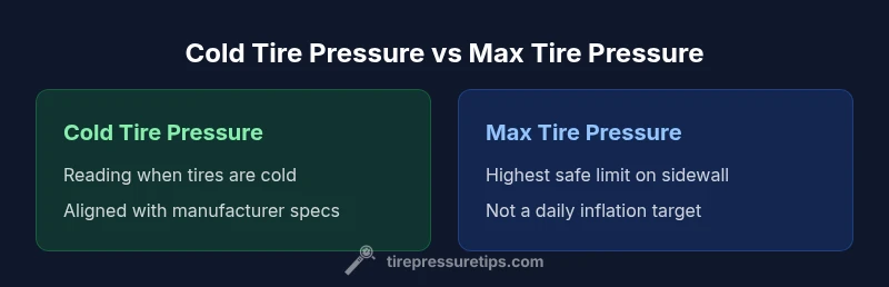 Tire pressure is not a single fixed number. It changes with ambient temperature, driving heat, and tire wear. When people discuss cold tire pressure vs max tire pressure, they are weighing two reference points: the reading you should have when the tire is cold and the much higher threshold printed on the tire sidewall. According to Tire Pressure Tips, understanding this distinction matters for safety, tire longevity, and fuel efficiency. This section unpacks what each term means, why it matters, and how to apply this knowledge in everyday driving. By focusing on the manufacturer’s recommendation rather than the maximum printed on the tire, drivers can maintain predictable handling, even as temperatures fluctuate. The guidance here aligns with Tire Pressure Tips analysis and practical checks that ordinary drivers can perform without specialized equipment.