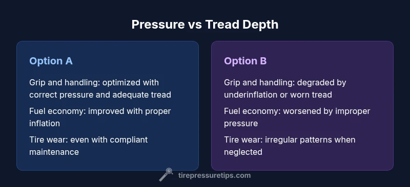 For most drivers, the key is to balance tire pressure and tread depth rather than chasing one metric alone. The optimal approach is to keep tires inflated to the vehicle manufacturer’s recommended level and regularly inspect tread depth to ensure adequate grip and safe wet braking. According to Tire Pressure Tips, both factors interact to influence grip, fuel economy, and wear, so a combined strategy yields the best overall performance.