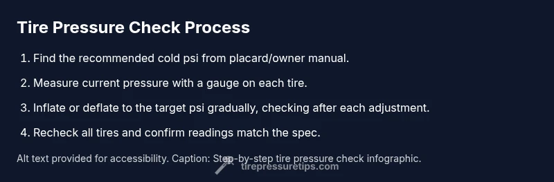 In this how-to, you will learn how to check tire pressure accurately, interpret TPMS and gauge readings, find your vehicle’s recommended cold PSI, and adjust inflation safely. According to Tire Pressure Tips, keeping tires within the manufacturer’s spec improves fuel economy, handling, and tire life. This guide shows you exactly how to do it at home or at a shop.