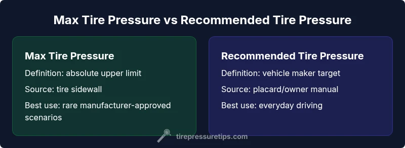 According to Tire Pressure Tips, the max tire pressure is the absolute upper limit printed on the sidewall, while the recommended tire pressure is the vehicle-maker target for normal loads and speeds. For most driving, inflate to the recommended number to balance safety, wear, and handling; only exceed that value when manufacturer guidance specifies for heavy loads or high-speed conditions.
