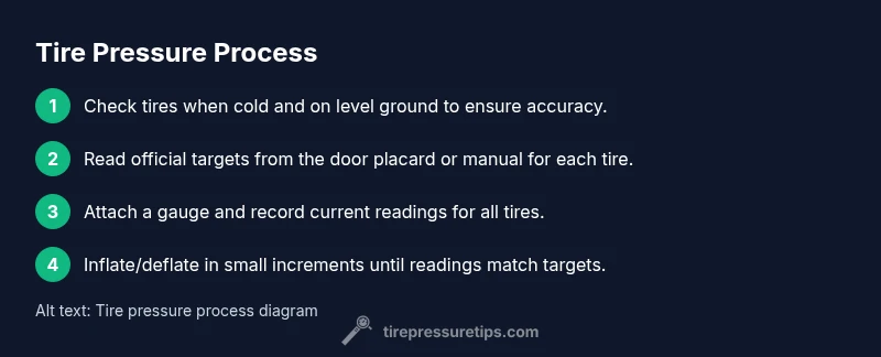 Check the placard on the driver’s door and measure with a gauge when tires are cold, then inflate to the specified target.