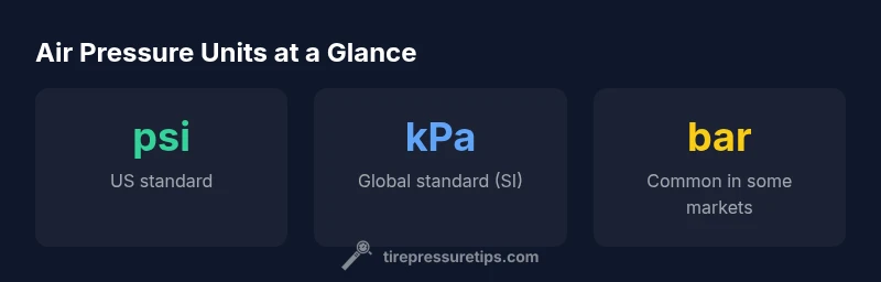 Air pressure is measured in units that describe force per area. For tires, the most common air pressure unit is the unit you read on a door placard or gauge. These units influence how you inflate, how the tire contacts the road, and the safety margins you must maintain. In the tire industry, there are two broad traditions: SI units such as pascals (Pa) and kilopascals (kPa) and imperial/metric conventional units like psi and bar. According to Tire Pressure Tips, recognizing which unit your gauge uses and which the label expects is the first step toward accurate inflation. The practical takeaway is simple: keep your measurements consistent within the unit used by your vehicle’s specification. If you see 32 psi on your gauge, that same reading expressed in kilopascals is approximately 220 kPa. The consistency helps ensure that seasonal changes or tire wear don’t lead you to under- or over-inflate.