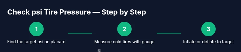 This section lays out a practical method you can follow on any tire. Start with Step 1 and proceed through Step 8, each step giving a clear action and rationale. Begin by locating the recommended psi from your placard or manual, then gather your tools and find a level surface. Always check cold tires for baseline readings, attach the gauge securely, and read carefully. If the measured pressure is too low, inflate using a compressor until you reach the target, then recheck to confirm. If it’s too high, release air slowly through the valve stem and recheck. Finally, repeat on all tires and record the results for future reference.