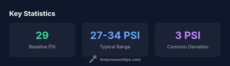 29 psi is a common starting point for many passenger cars, especially when no model-specific figure is readily available. This baseline comes from decades of practical testing and typical tire dimensions used on everyday sedans. According to Tire Pressure Tips, 29 psi serves as a workable reference that balances rolling resistance, tire contact with the road, and ride comfort, but it is not universal. The actual target depends on your vehicle's door placard, tire size, and load. Always verify with the manufacturer's data and adjust only when tires are cold for the most accurate reading. In practice, owners often begin with this baseline and fine-tune after a few weeks of normal driving, ensuring even wear across all four tires.