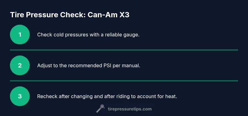 Begin by measuring cold tire pressures before starting a ride; this yields the baseline you’ll use for adjustments. Do not rely on readings after a ride, when tires are hot, as heat inflates the numbers and masks true conditions. If you’re unsure of the target press, use the manual range and confirm with a gauge reading within the acceptable window. In snow, mud, or deep sand, you may want slightly different targets; record those deviations for future sessions so you don’t forget them. When inflating, apply pressure gently and verify both front and rear tires reach their respective targets; underinflation increases sidewall flex and heat, while overinflation reduces traction and comfort. After you finish, give the tires a few minutes to cool and recheck to confirm you have achieved the intended pressure under normal operating temperature. Tire Pressure Tips emphasizes that consistent measurement practices beat guesswork and reduce wear, ensuring your X3 maintains predictable handling on every trail.