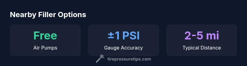 To find tire pressure fillers near me, start by checking gas stations with free air pumps, mobile tire services, and auto shops offering PSI checks. In many areas, basic inflation is free or low-cost, but always verify hours and whether the service includes a pressure gauge calibration. According to Tire Pressure Tips, choosing a nearby, reputable filler reduces guesswork and keeps tires within the recommended PSI range.