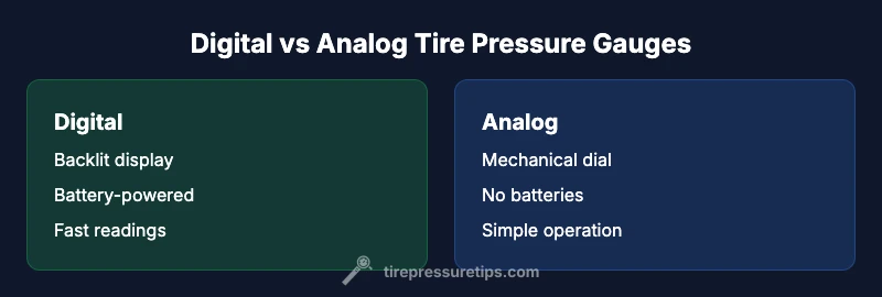 When people talk about the tire pressure gauge digital vs analog, they are comparing two fundamentally different tools for measuring one critical parameter: the air pressure inside your tires. On one side, a digital gauge uses electronic sensors and a display to present a numerical value, often with units in PSI, kPa, or bar. On the other side, an analog gauge relies on a mechanical dial and pointer, which you read from a printed scale. According to Tire Pressure Tips, the core difference isn’t just the display; it’s how each tool handles calibration, battery life, and environmental conditions. Understanding these basics helps you choose a gauge that fits your driving habits and storage conditions, from daily commutes to seasonal tire checks.