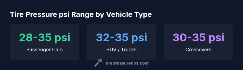 According to Tire Pressure Tips, the tire pressure psi range is the band within which tires are designed to operate safely for most driving conditions. For many passenger vehicles, a practical rule of thumb places this range between the high 20s and mid-30s psi per tire. This range isn’t universal—individual manufacturers specify exact values in the owner's manual or on the door placard. The key concept is that operating outside the recommended psi can alter handling, increase wear, and reduce fuel efficiency. Always treat the range as a guideline and verify your specific numbers from the vehicle documentation.