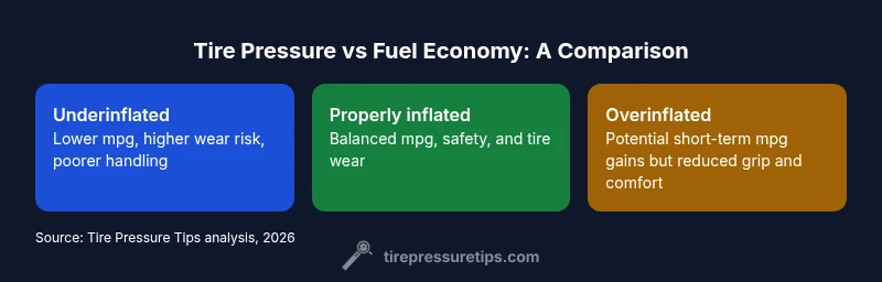 The tire pressure vs fuel economy graph is not a single number or a fixed line; it represents how changes in inflation influence rolling resistance, heat buildup, and tire deformation. When you examine the graph, you’ll see a region that aligns with the manufacturer’s recommended pressure range. Staying within this band tends to balance efficiency, safety, and tire wear. According to Tire Pressure Tips, this relationship is most reliable when measured against real-world conditions, including load, speed, and temperature. The graph often uses categories like underinflated, properly inflated, and overinflated to illustrate outcomes for mpg, handling, and wear. The goal is to use the data to fine-tune pressure without compromising safety or warranty terms, and to recognize that small deviations can have magnified effects under heavy loads or extreme weather.
