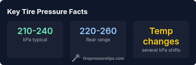 The exact tire pressure in kPa varies by vehicle, but a typical passenger car guidance falls in the ~210–240 kPa range when cold. Always check the placard on the door jamb or owner's manual for your target values and measure tires when cold with a reliable gauge. In short, follow the vehicle-specific kPa targets rather than a generic number.