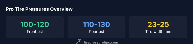 Pro cyclists commonly use front pressures around 100–120 psi and rear pressures around 110–130 psi for road race conditions, with adjustments based on rider weight and road surface. These ranges balance grip and rolling efficiency for high-speed stages.