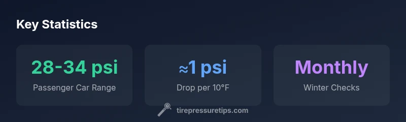 There is no single universal number for winter tire pressure psi; it varies by vehicle and tire type. In general, passenger cars often settle in the 30-34 psi range when cold, while many SUVs and light trucks sit around 34-38 psi. Always start with the vehicle placard, then consider the tire’s design and load. Heavier loads or high-speed driving can justify a modest increase within the manufacturer’s recommended band. If you use winter-specific tires, the target may shift slightly, but the official spec remains the anchor. For mixed weather or frequent passenger loads, err on the conservative side and aim for the mid-point of the recommended range rather than the extreme end. This practice maintains traction on slippery surfaces without sacrificing comfort or tread wear. Our analysis at Tire Pressure Tips shows that following the placard remains the most reliable baseline, even when you experiment within the allowable range.