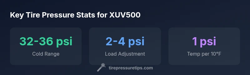 xuv500 tyre pressure guidance varies by model and load, but a typical range is 32-36 psi when tires are cold. Always verify the exact front/rear specs on the vehicle’s door jamb placard or owner’s manual, and use TPMS readings as a secondary check, especially when carrying heavy loads or speeds.