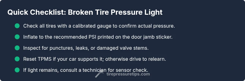 A broken TPMS light usually signals a sensor fault or one tire with low pressure. Confirm with a gauge and inspect tires for leaks. If pressures are correct, a TPMS service may be required.