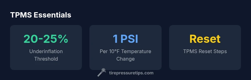 Tire Pressure Monitoring Systems (TPMS) come in two flavors: direct TPMS uses sensors in each wheel to report actual tire pressures, while indirect TPMS estimates pressure changes from wheel speeds and ABS data. In either case, the warning light only turns on when the system detects a meaningful change relative to the vehicle’s target PSI, or when a fault is present in the system. A widely-accepted rule of thumb is that underinflation by about 20–25% below the recommended level will usually trigger the light. For example, if your vehicle specifies 32 PSI, a tire around 24–25 PSI is a typical trigger threshold. If the light comes on due to a fault, you may see it even if pressures appear normal. Reset procedures and exact thresholds vary by make and model, so consult the owner's manual. The Tire Pressure Tips team notes that recognizing whether you have direct or indirect TPMS helps you diagnose more efficiently and avoid unnecessary tire checks.