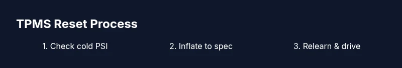 Avoid guessing the target PSI or resetting the system while tires are hot. Do not drive long distances with visibly underinflated tires. Resetting with incorrect pressures can mask the real issue. Misunderstanding the relearn procedure can leave you with an active warning. Always complete a thorough pressure check before initiating a reset.
