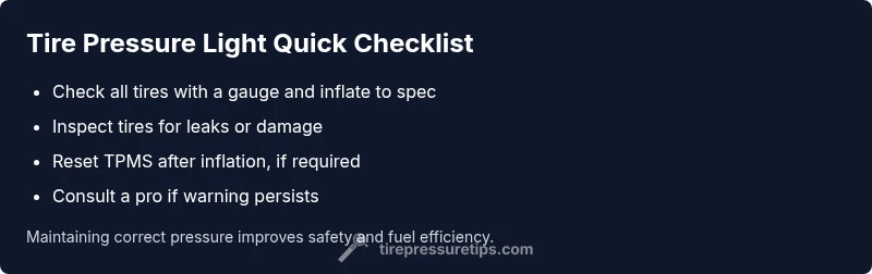 The tire pressure check light is usually triggered by one or more tires that are underinflated or by a faulty TPMS sensor. Quick fix: check all tires with a reliable gauge and inflate to the vehicle’s recommended pressure (printed on the door jamb or in the owner’s manual). If the light remains after inflation, reset the TPMS per your manual or seek a tire professional. According to Tire Pressure Tips, most people experience a gradual loss or a sensor recalibration need.