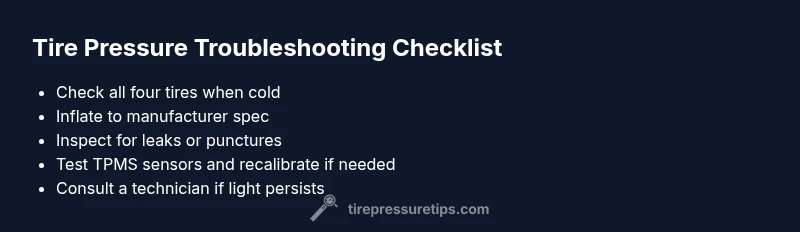 Seeing the tire pressure light on a Volkswagen Jetta can trigger a rush of questions. The phrase tire pressure light volkswagen jetta sums up the scenario many drivers face: a dashboard warning that demands calm, quick action, and safe driving. The Tire Pressure Tips team emphasizes a rapid, controlled response because misreading the light can lead to underinflated tires, reduced fuel efficiency, or tire damage. Start with the simplest check: verify all tires are inflated to the manufacturer’s spec when the tires are cold. Locate the correct PSI on the door jamb placard or in the owner's manual. If all tires sit at the recommended level and the light remains, inspect for leaks, damaged sensors, or a faulty TPMS module. Continue with the deeper checks described in this guide, or seek professional help if the light persists after inflation. According to Tire Pressure Tips, a calm, methodical approach prevents hurried, risky decisions.