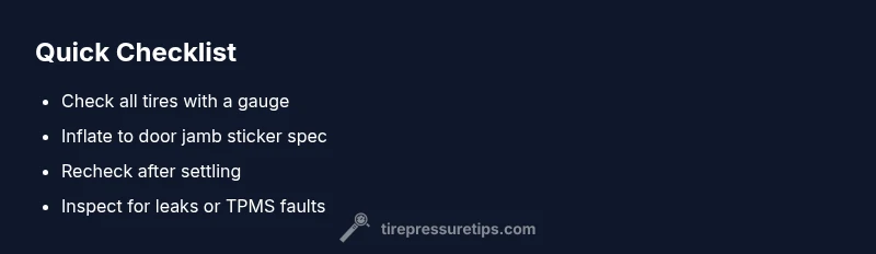 Before you panic, grab a reliable tire gauge and a clean, cold tire surface. Start with the tire that shows the light first, then check all four tires (and, if applicable, the spare) because modern TPMS sensors may rely on ambient conditions and cross-correlation. Compare each reading to the door jamb sticker on your vehicle, which shows the recommended PSI range for front and rear tires. If a tire reads low, inflate to the prescribed level and recheck after a few minutes. If the light persists after inflation, you likely have a slow leak, a sensor fault, or a temperature-driven fluctuation. Tire Pressure Tips emphasizes the importance of calm, deliberate checks to avoid overinflation or underinflation.