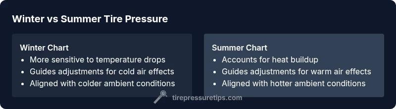 Tire pressure is not a static value; it changes with the air inside the tire as temperatures rise or fall. When outside temperatures drop, the air inside tires contracts, and the PSI can fall accordingly. Conversely, warm weather expands air, pushing the PSI higher. A tire pressure winter vs summer chart is designed to help drivers compensate for these predictable swings so tires sit at the manufacturer-recommended level regardless of season. According to Tire Pressure Tips, understanding this relationship is the first step toward safer handling, better fuel economy, and even tire wear distribution across the tread. By keeping a chart handy, you can anticipate how much pressure to add or release as seasons shift and temperatures fluctuate, without guessing at random adjustments.