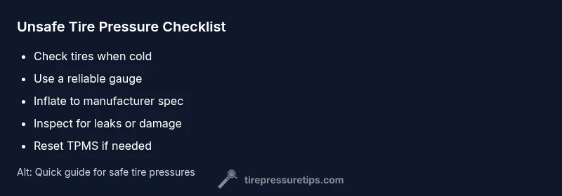 Unsafe tire pressure affects more than just the feel of the ride. Underinflation can cause the tire to flex and heat up, increasing the chance of a blowout at highway speeds. Overinflation reduces the tire's contact patch, diminishing grip and making you more vulnerable to road hazards. The Tire Pressure Tips team's practical guidance emphasizes that 'unsafe tire pressure' is a sign you should address immediately. Regularly checking pressures against the vehicle's recommended range helps maintain predictable handling, stable braking, and even wear. If you notice the TPMS warning light, or if a tire appears visibly low (or high) when parked, treat it as urgent. In any case, correcting pressure should be your first response before continuing a trip, especially on long drives or in harsh weather. Always ensure tires are cold before measuring and rechecking after a drive.
