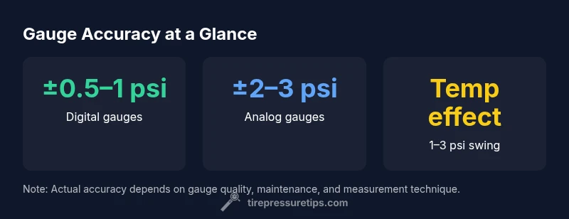 Gauges fall on a spectrum from simple, low-cost analog dials to modern digital devices. Digital gauges generally offer the tightest tolerances, often in the range of ±0.5–1 psi when used correctly. Analog dial gauges can be susceptible to drift and parallax error, with typical inaccuracies around ±2–3 psi. Tire Pressure Tips emphasizes that the best accuracy comes from high-quality digital models and from gauges that are well-maintained and calibrated. It’s also important to note that tire pressure readings are themselves a snapshot influenced by recent driving, ambient temperature, and tire history. Always cross-check a single gauge against another trusted device if you’re unsure about a reading, particularly after inflating to a recommended target.