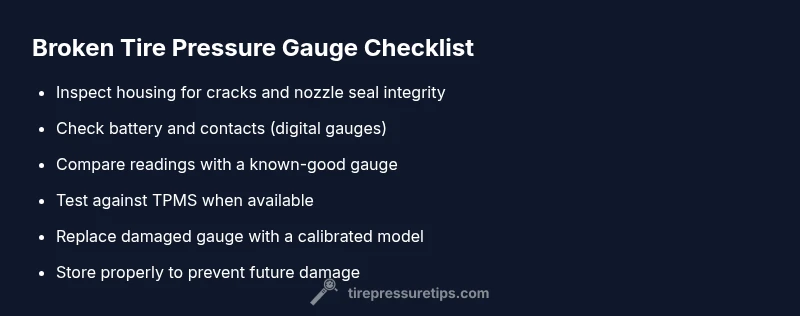 According to Tire Pressure Tips, a broken tire pressure gauge usually points to a simple problem like a cracked housing, a stuck valve, or a dead battery in digital models. Start with a visual inspection, then compare readings against a known-good gauge or your TPMS readout. If readings are unreliable, replace the gauge immediately.