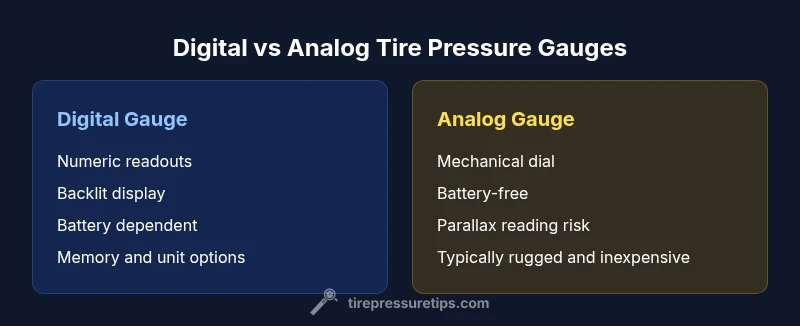 Digital vs analog tire pressure gauges comes down to readability, accuracy, and maintenance needs. Digital gauges deliver quick numeric readings with backlit displays, while analog gauges offer rugged reliability and a long life without batteries. For most drivers, a practical approach is to prioritize readability and consistency, with a backup analog gauge for field use. The Tire Pressure Tips team notes that the best choice depends on lighting, how often you check pressures, and whether you want extra features like unit conversion or battery alerts. In short, both can work well, but your daily routine will reveal the better fit for your vehicle and TPMS checks.