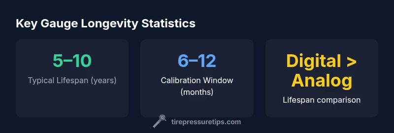 According to Tire Pressure Tips, understanding how long tire pressure gauges last helps drivers budget for replacements and maintain accurate readings. The lifespan of a gauge depends on build quality, frequency of use, and how well it7s cared for. In practice, you7ll find that the typical lifespan ranges from about 5 to 10 years for most standard gauges, with higher‑quality digital models often lasting longer. The key point is that longevity isn7t fixed; it7s a function of design, usage, and maintenance. This knowledge helps drivers set expectations and plan preventive steps rather than wait for a failure to occur.